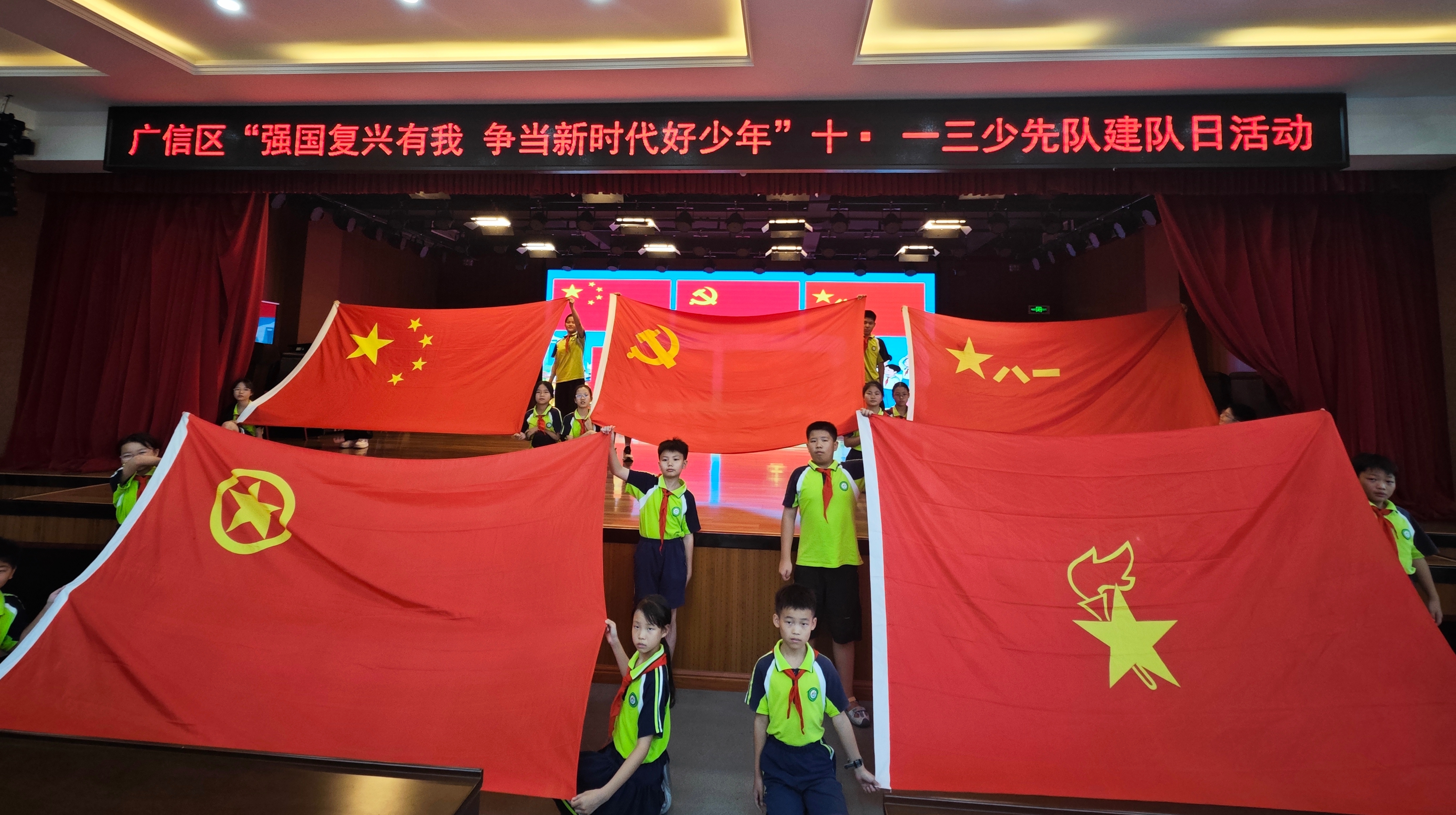 10 月 11 日下午,江西省上饶市广信区第一小学报告厅里掌声阵阵、歌声飞扬,260名少先队员代表齐聚于此,共庆中国少年先锋队第76个建队日,一场以“强国复兴有我,争当新时代好队员”为主题的队日活动暨“五旗传递” 仪式热闹开场。广信区委副书记徐卓、共青团广信区委书记张天琦等领导到场,与队员们一起参与活动。