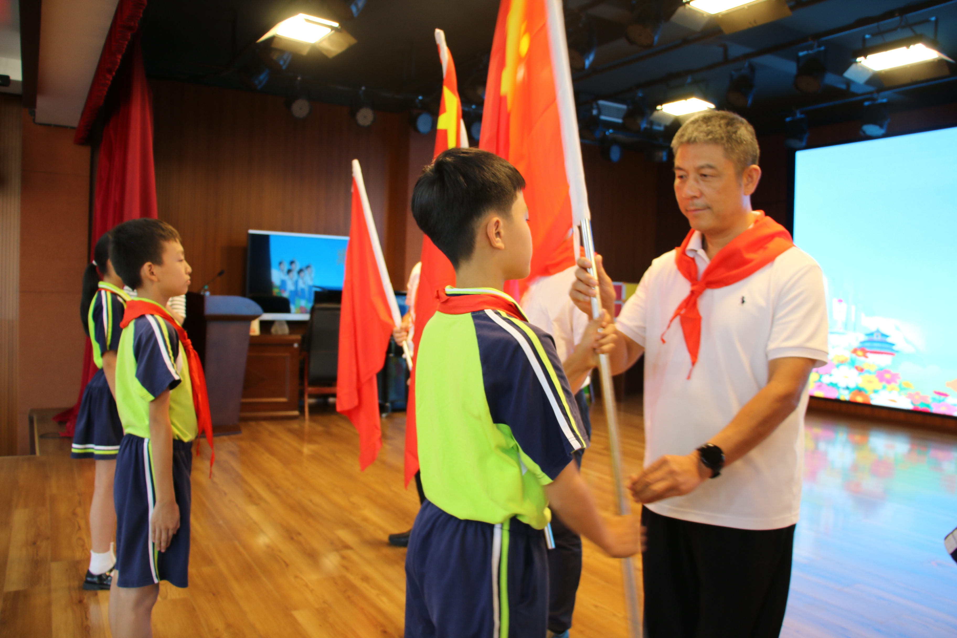 最令队员们热血沸腾的当属“五旗传递”仪式!伴随着激昂的乐曲,中国共产党党旗、中华人民共和国国旗、中国人民解放军军旗、中国共产主义青年团团旗、中国少年先锋队队旗依次展开,在队员们头顶缓缓传递。大家纷纷伸出小手轻触旗帜,目光坚定行注目礼,仿佛触摸到了历史的厚重与时代的力量。徐卓等领导还亲手将五面旗帜授予队员代表——接过党旗,是接住了永远跟党走的信念;接过国旗,是接住了振兴中华的光荣使命,这一递一接,传递的不仅是旗帜,更是红色基因的传承与强国责任的交接。